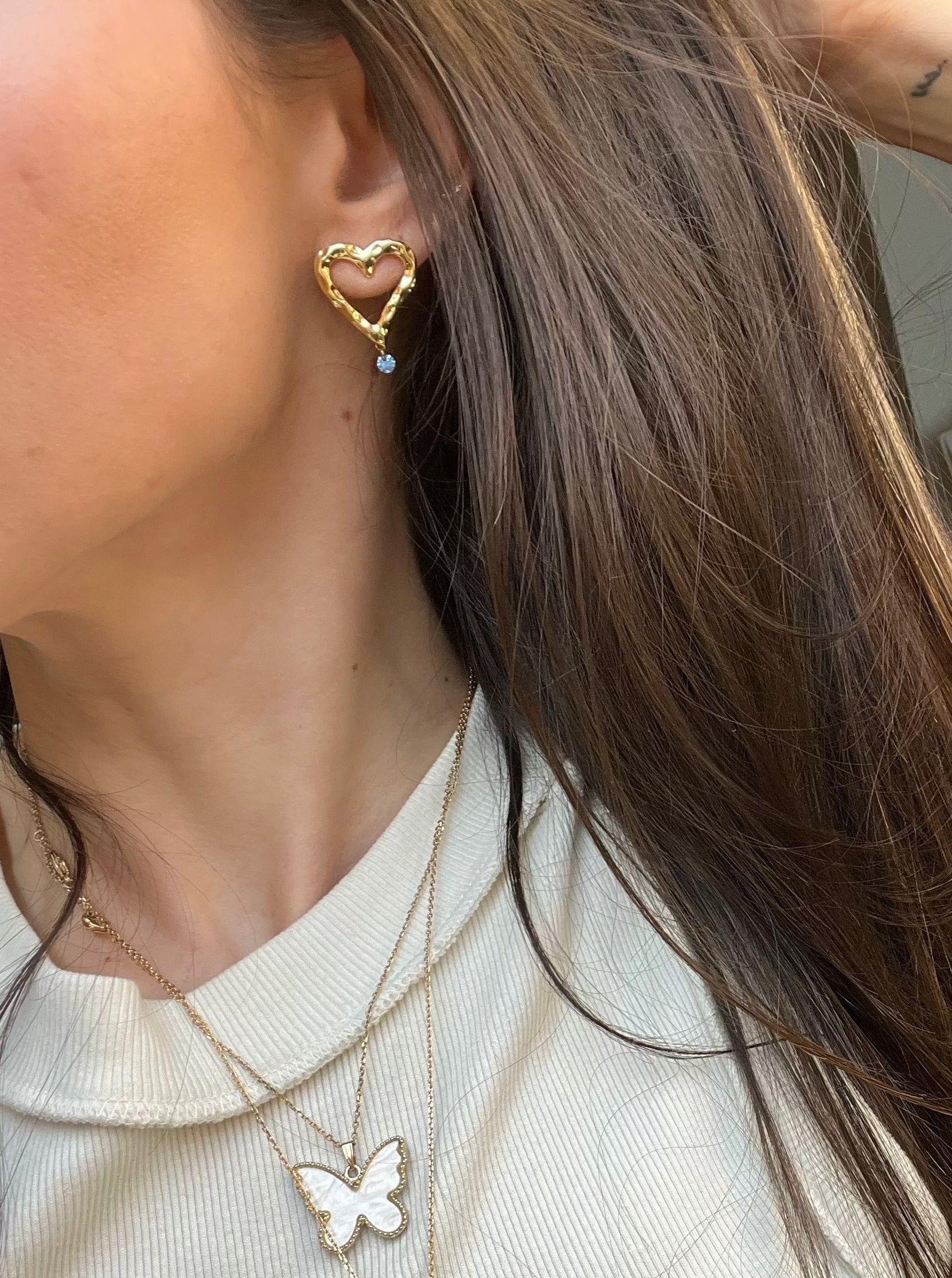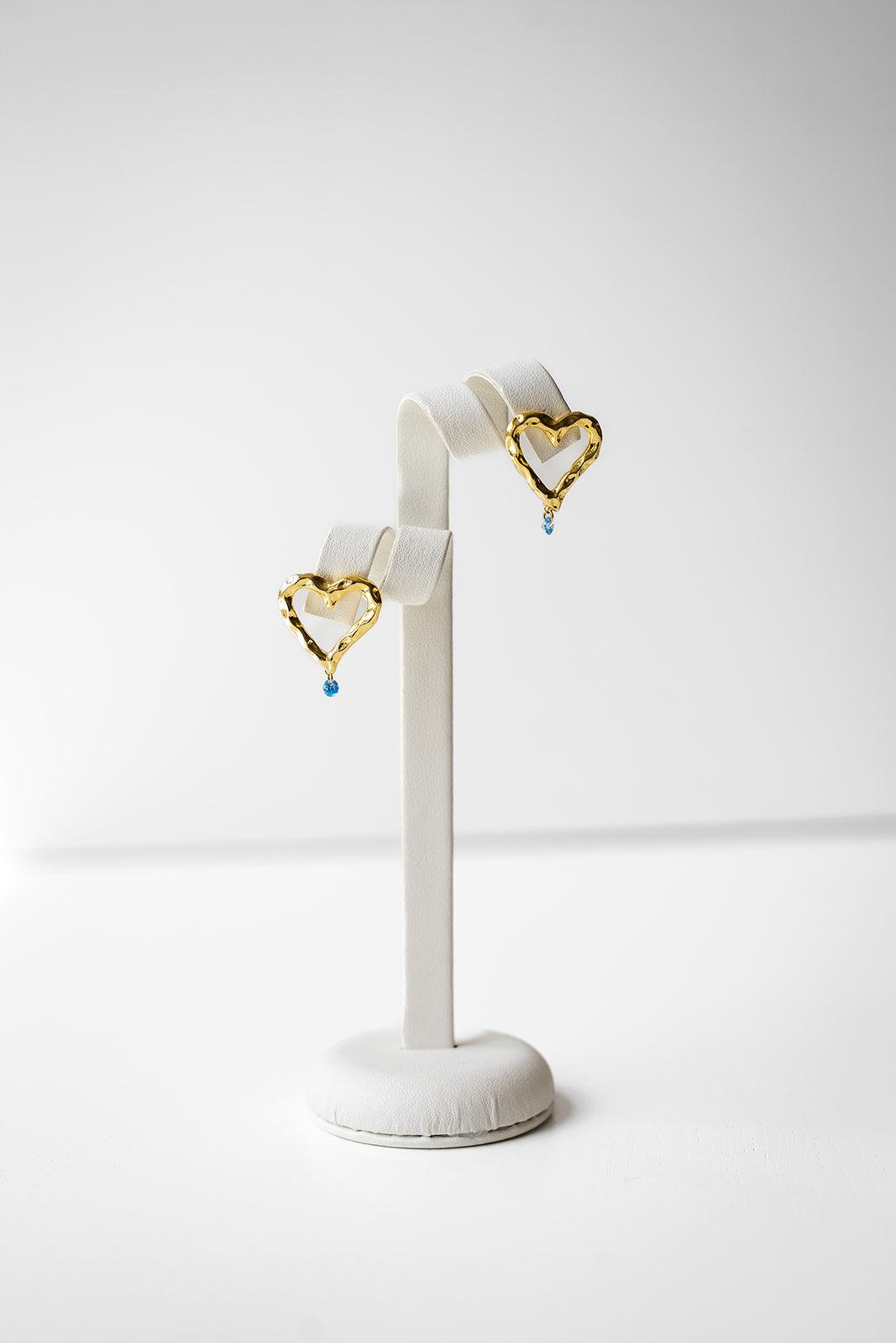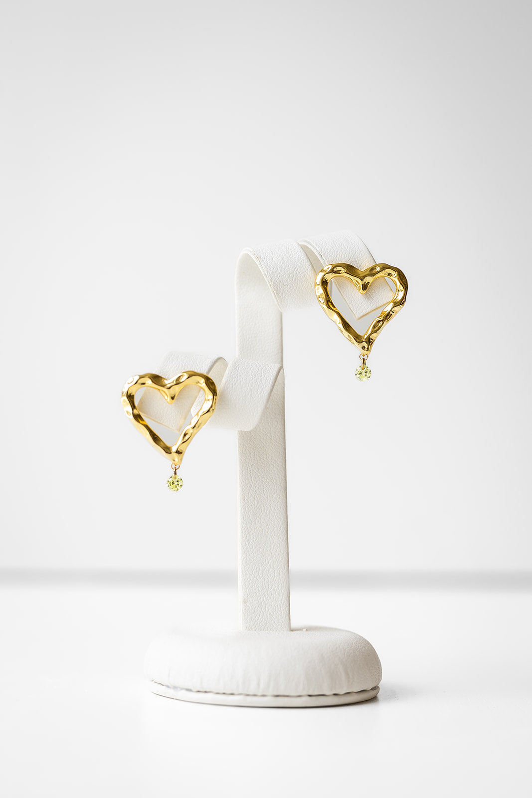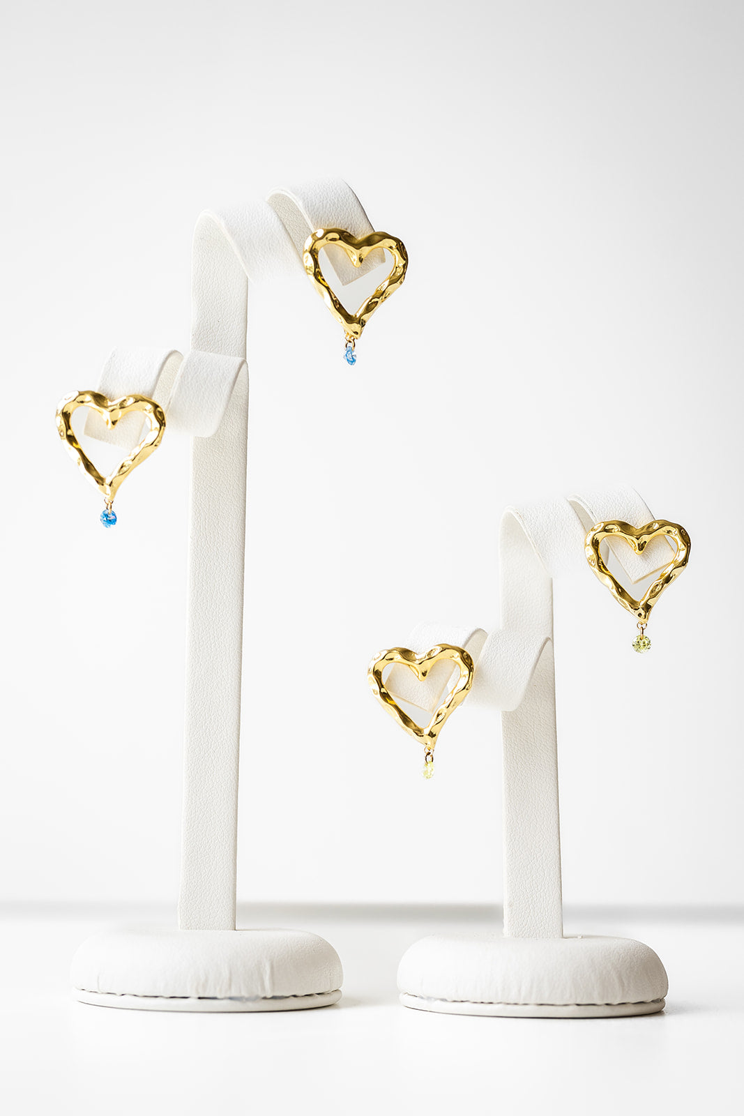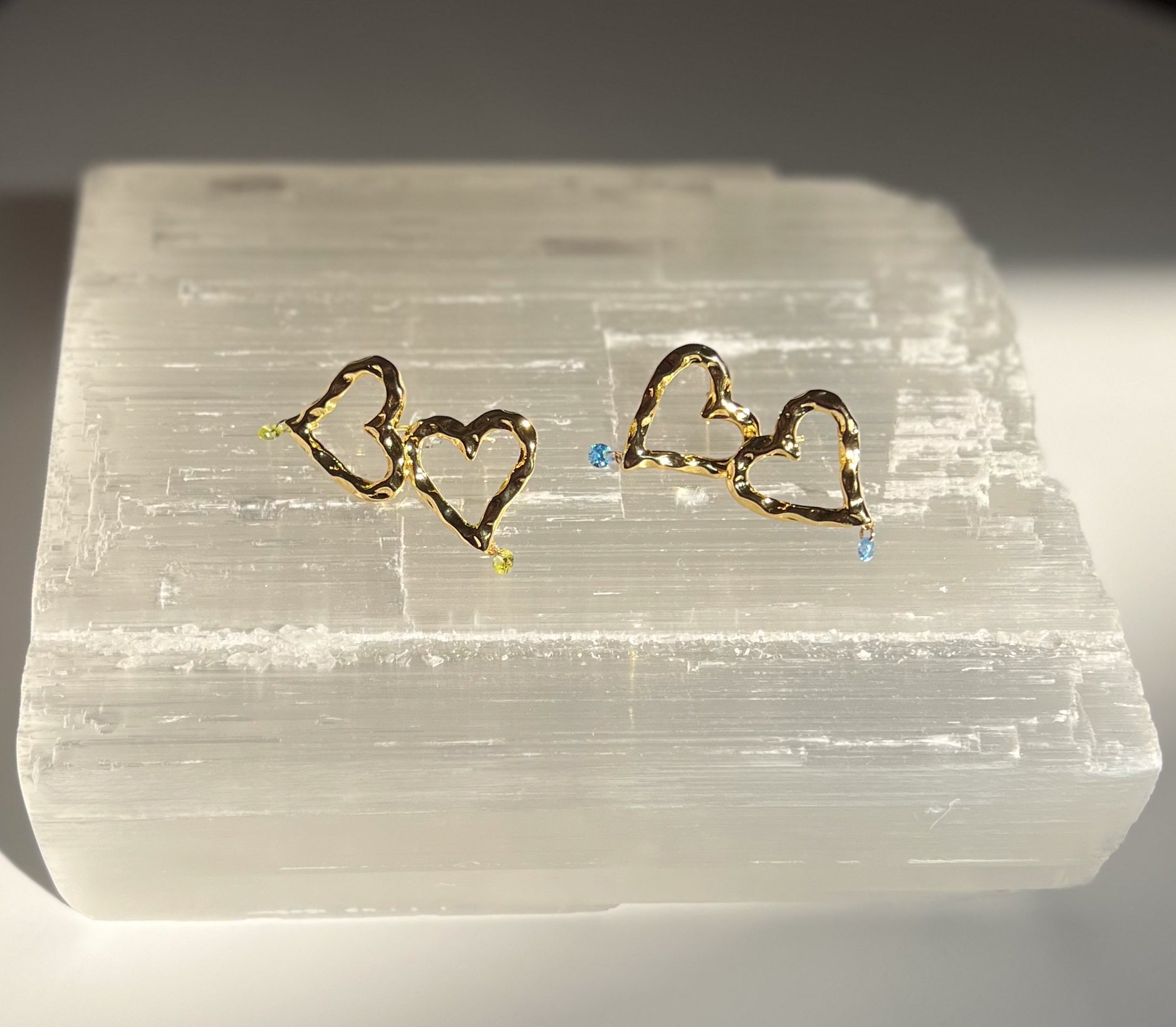 Swinging from the bottoms of these hammered gold heart earrings are colorful, brilliant cut stones available in your choice of either vibrant blue or citron green. The La Fontelina Heart Earrings add a touch of glamour and romance to any outfit. These golden heart earrings have stolen mine!