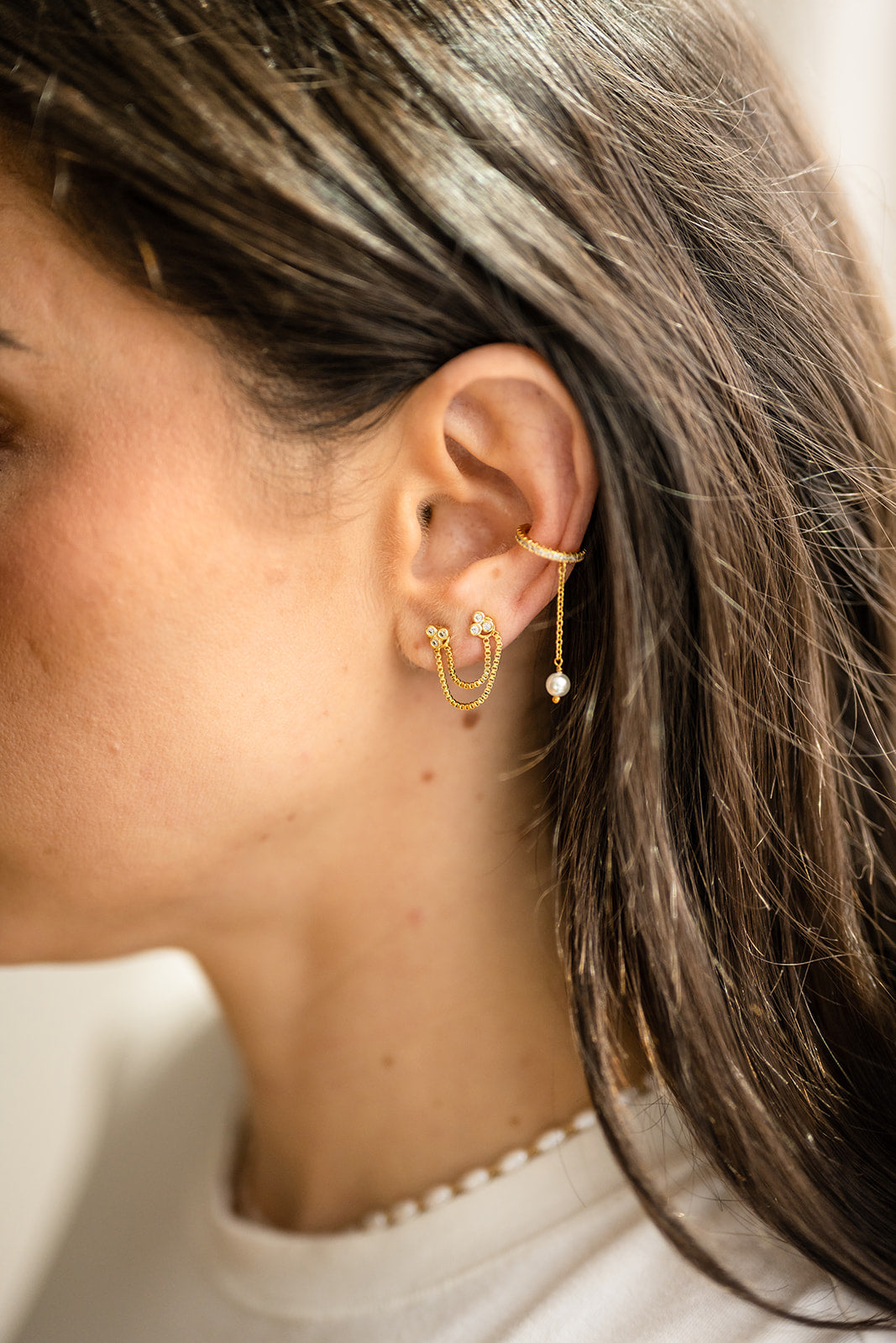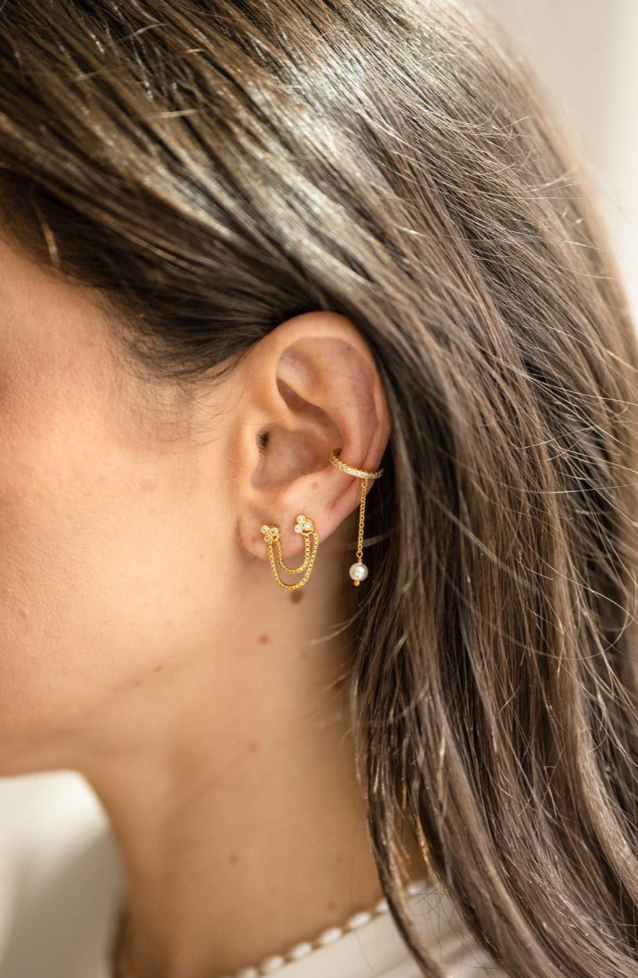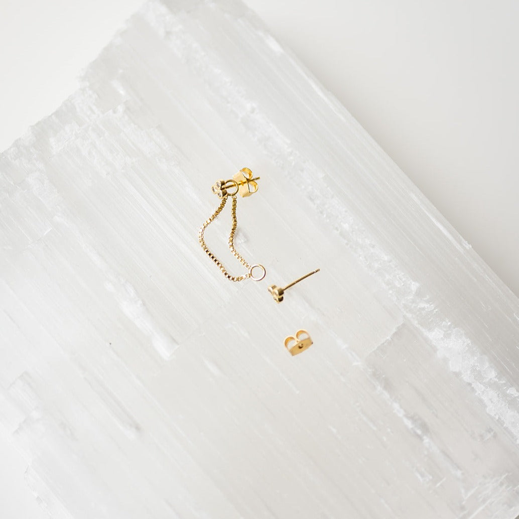 The three stone, bezel-set earrings are adorned with a detachable chain connector, bridging the two studs and taking your earring stack to the next level! This single side connector earring requires two piercings on the ear. Simply detach the chain connector to separate the earrings and style!