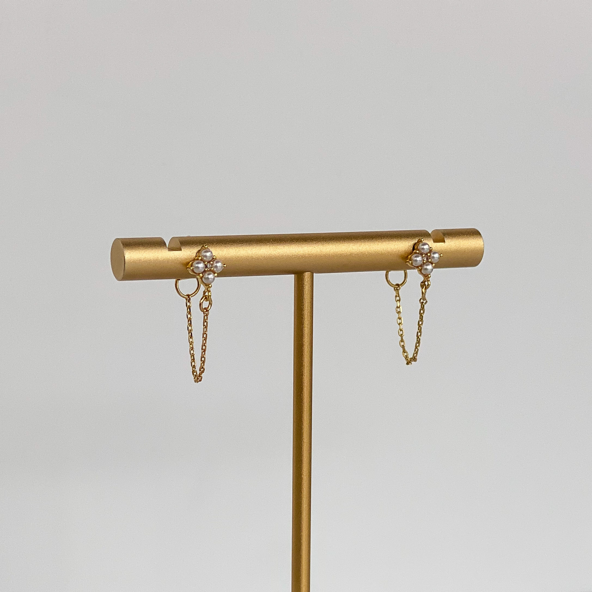 The 6x6mm gold plated stud Erin earrings with faux pearls and connected gold plated chain earring back.The Erin earrings as a pair or styling as a single to mix and match in your second or third piercings!