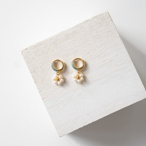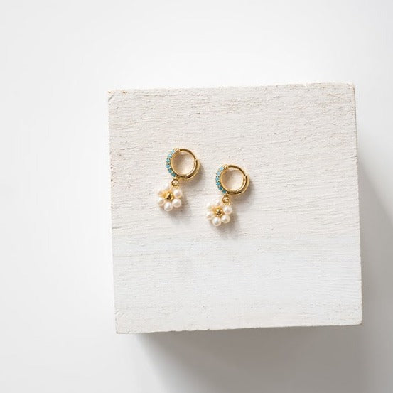 The "Fiore" huggies, meaning "flower" in Italian, are a perfect summer earring to rotate into your warm weather earring stack. Designed to add a subtle pop of color to your ensemble, these gold huggie earrings feature vibrant turquoise pave stones that beautifully contrast with their golden canvas. Complete with beaded pearl daisy pendants, these colorful earrings embrace the essence of Spring.