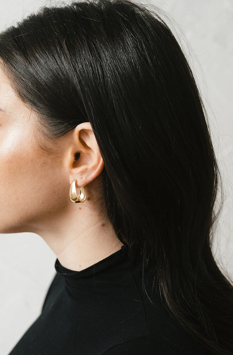 The Goldie Earrings are a perfect balance of chic and timeless elegance. These gold teardrop hoop earrings make a subtle statement. The feather-light Goldie earrings are designed for all-day comfort and style. Their classic and versatile design will effortlessly take you from day to night.