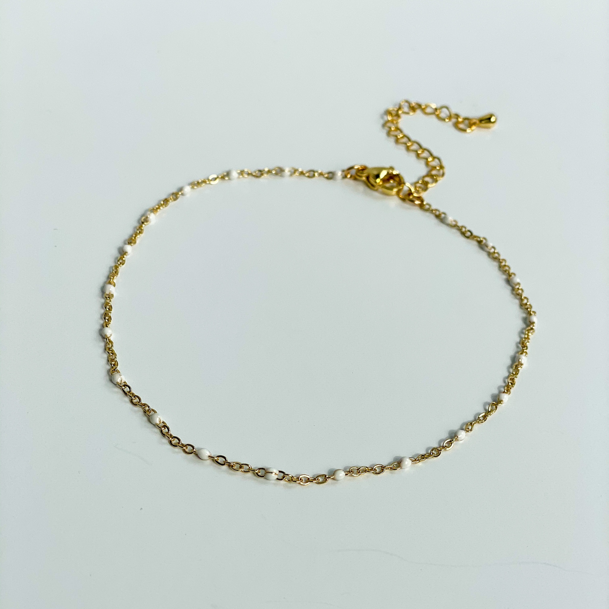 Product Materials: 2mm white enamel beads. 24k gold filled 2.5” adjustable extender.