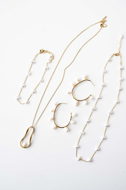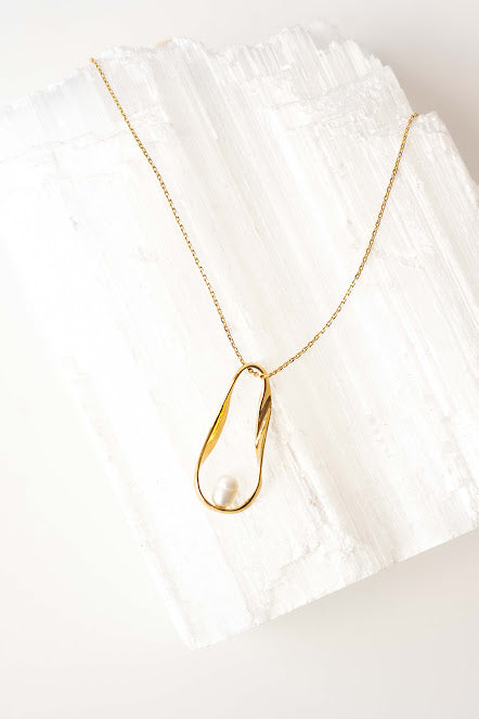 Looking for the perfect layering piece? Look no further than the La Perla. This dainty gold cable chain necklace adorns an asymmetrical oval shaped pendant with a fresh water pearl perched in its center.