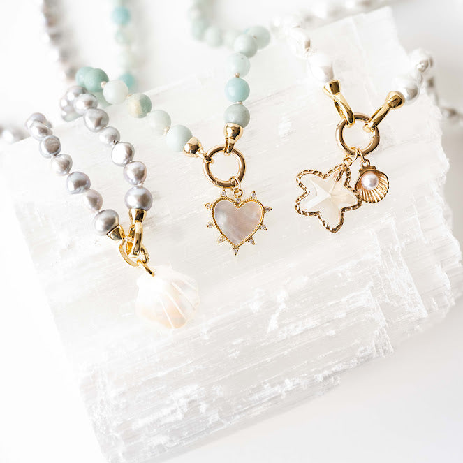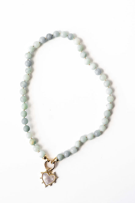 The L'Incanto Necklace, a 16.5" hand-knotted strand AAA grade amazonite beads, is adorned with a mother of pearl, heart shape pendant. A round spring gate clasp serves both functional and fashionable purposes, acting as the home base for the pearly heart pendant.