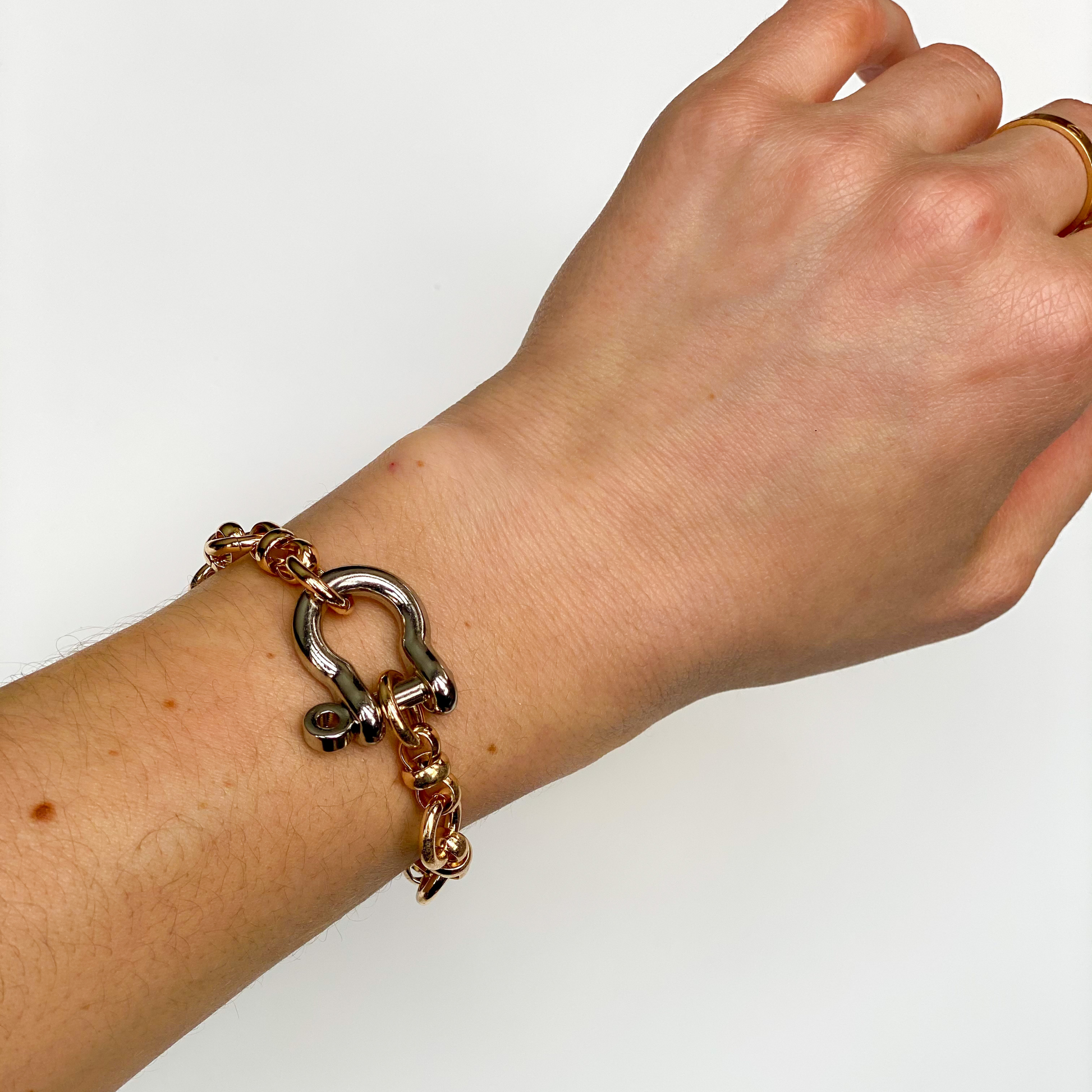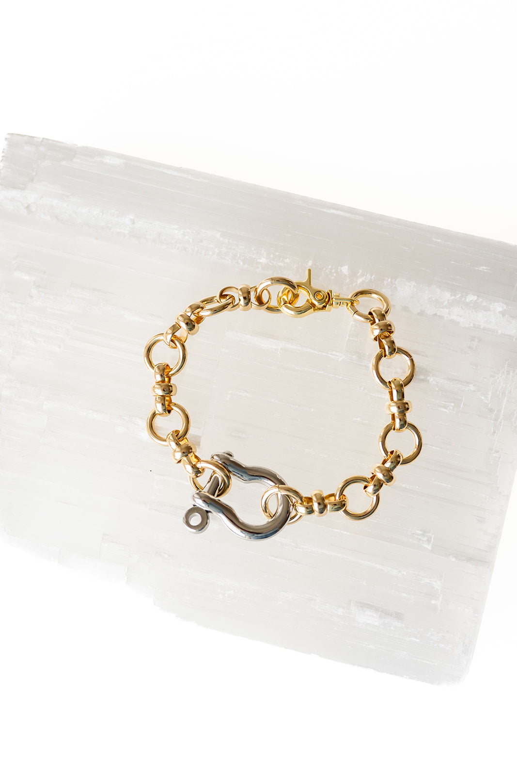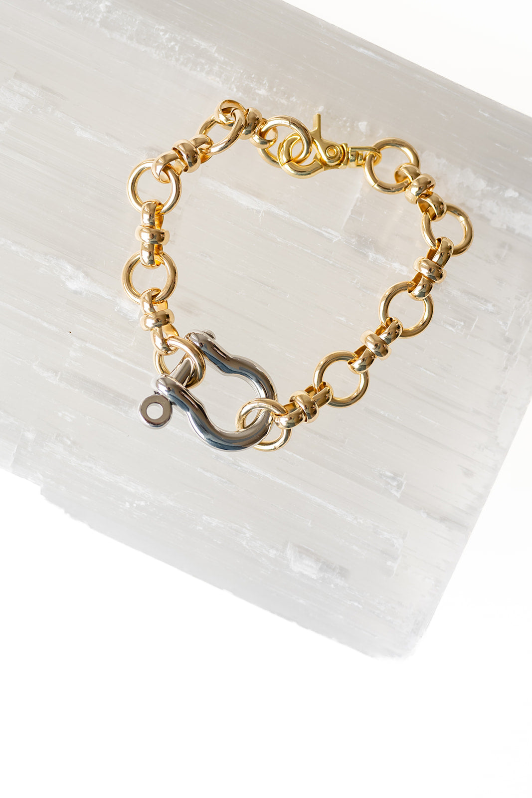 A luxe, two-tone statement bracelet. Like one of Anima Mea's best selling necklaces, the Lo Necklace in Shiny Gold, but with a large silver shackle. The Lo Bracelet features the Lo chunky chain you know and love in the "shiny gold" finish color way.