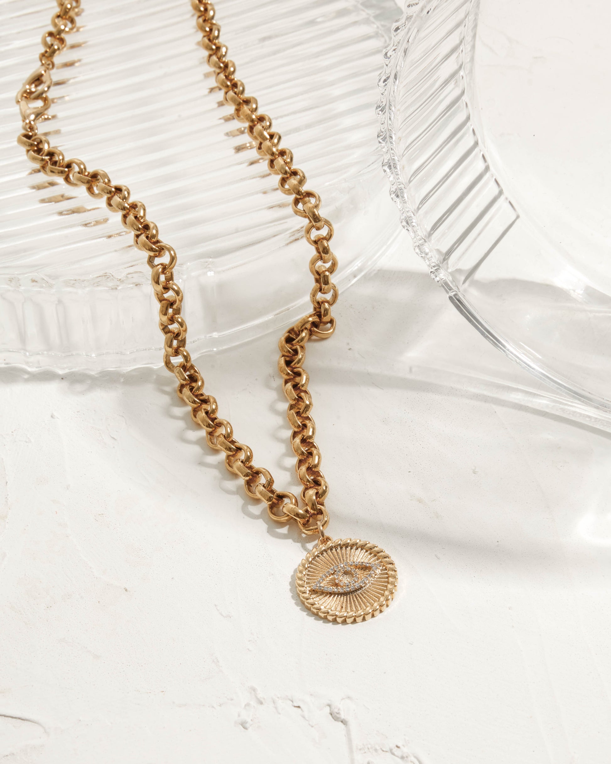 This 14k gold plated rolo chain with a gold evil eye coin pendant adds a little bit of luxe to anything it touches. With endless styling options, the Mikey chain makes everything effortlessly but undeniably cool.
