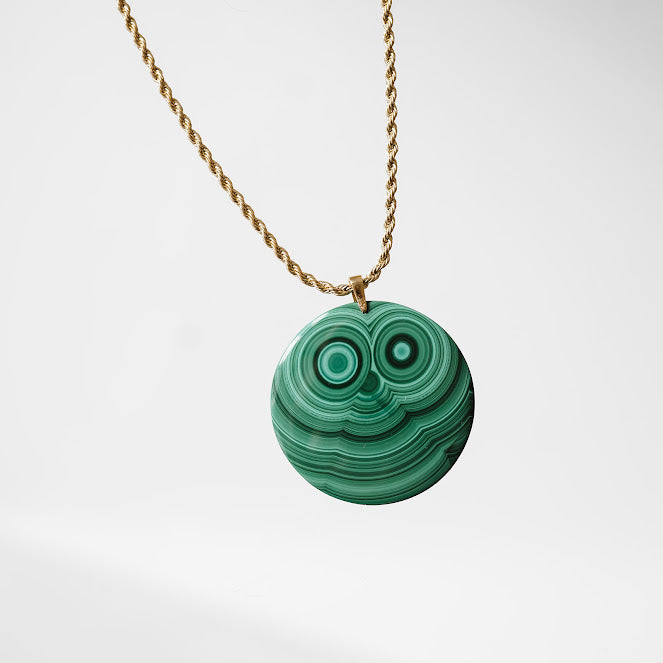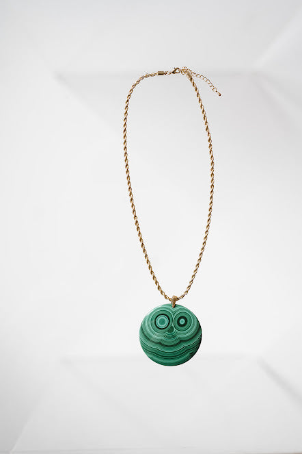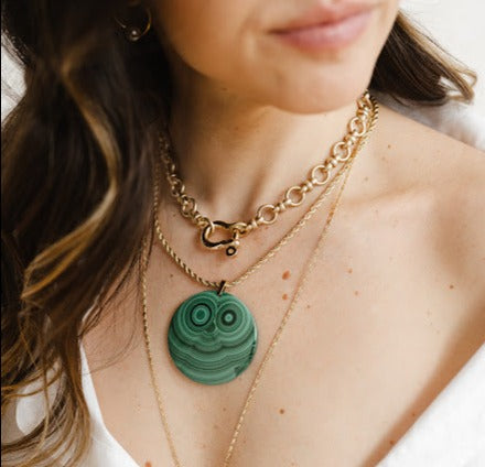 The circular gemstones are approximately 2" in diameter and a smooth, flat back for added comfort. The large, AAA grade malachite necklace lives on an adjustable gold plated rope chain.