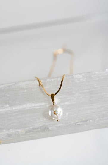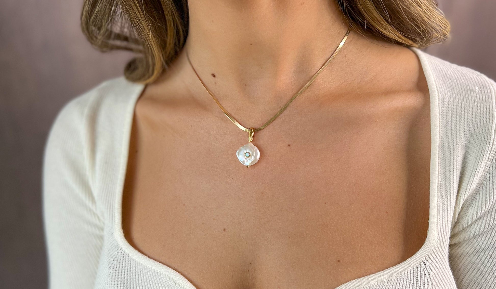 Clean and minimalistic. The Puglia Necklace showcases a baroque freshwater pearl pendant with a bezel-set opal on a gold herringbone chain necklace. The adjustable length allows for a customized fit, making it perfect for layering.
