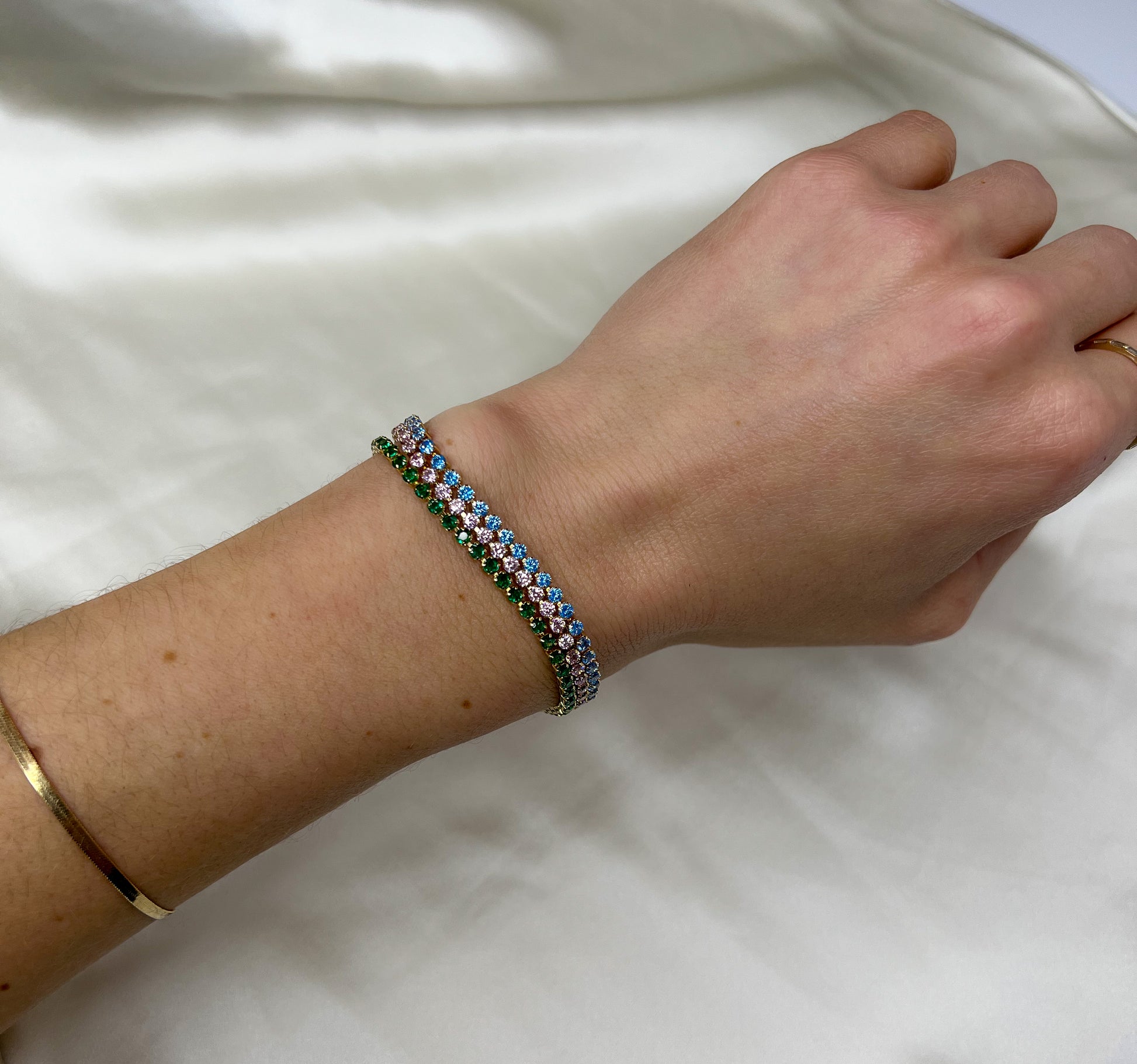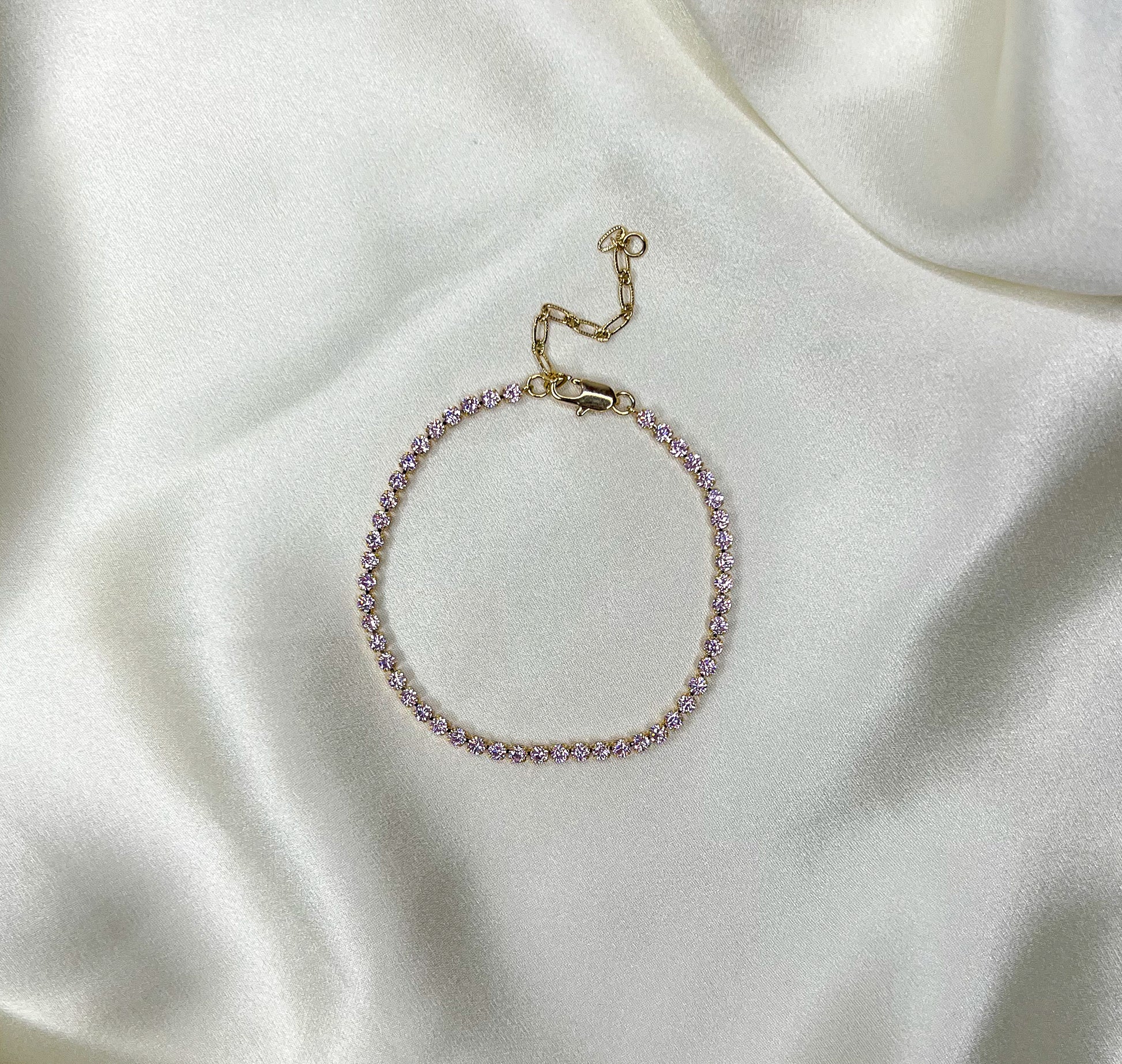 Product Materials/Dimensions: 2.5mm light pink tennis bracelet. Cubic zirconia stones. 14k gold plated. Water resistant coating.