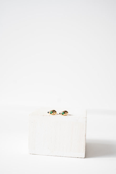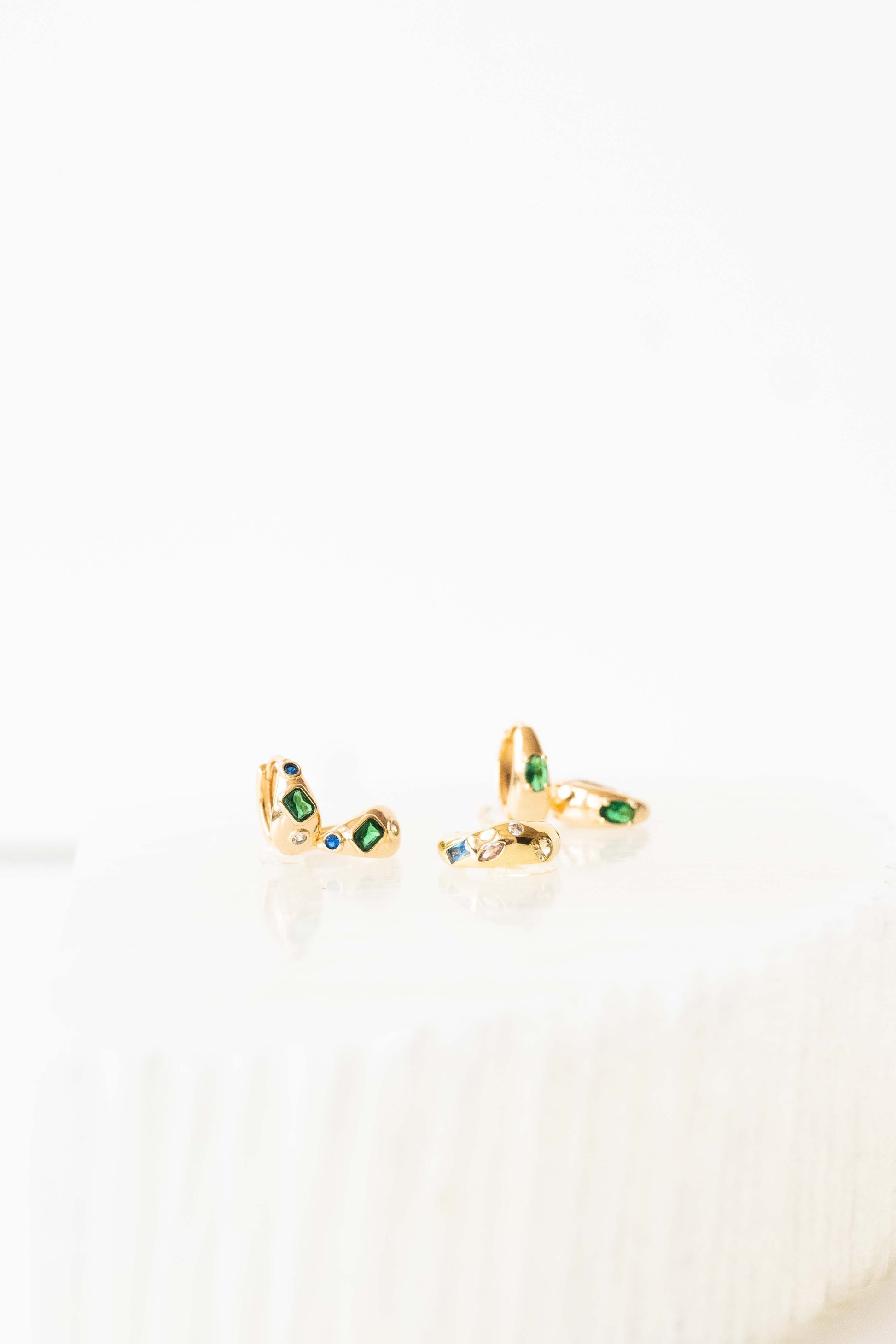 The gold Tuscany Huggie earrings feature three scattered pave stones in sapphire blue, emerald green, and diamond, creating a stunning multicolor effect. With their comfortable fit and versatile design, these huggies can be styled alone or stacked with other earrings to create a trendy and personalized style statement. Embrace the vibrant beauty of the "Tuscany" huggies, perfect for adding a touch of personality and color to any look.